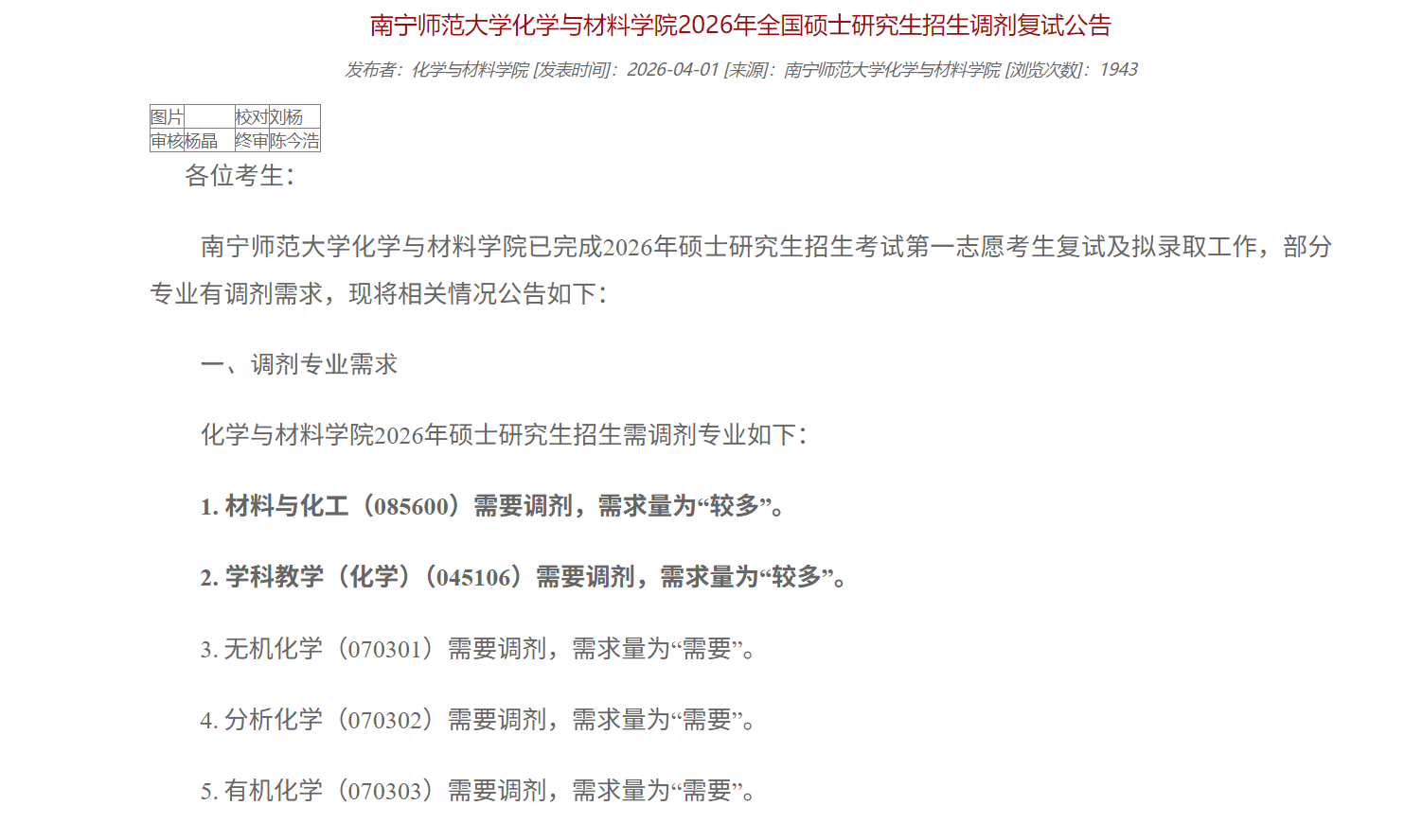 南宁师范大学化学与材料学院2026年全国硕士研究生招生调剂复试公告