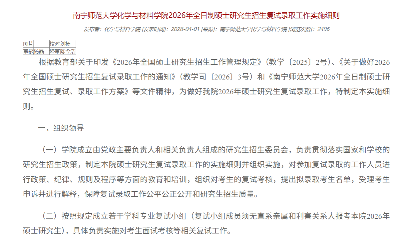 南宁师范大学化学与材料学院2026年全日制硕士研究生招生复试录取工作实施细则