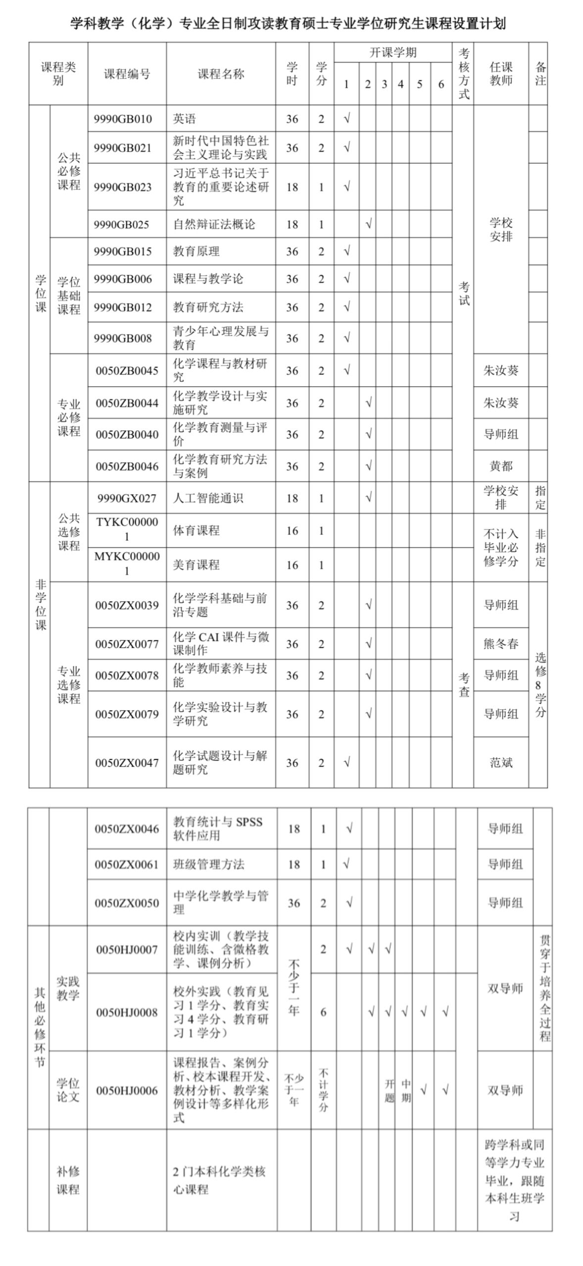 课程设置详见附表《学科教学(化学)专业全日制攻读教育硕士专业学位研究生课程设置计划》;专业必修课程说明见附件一。