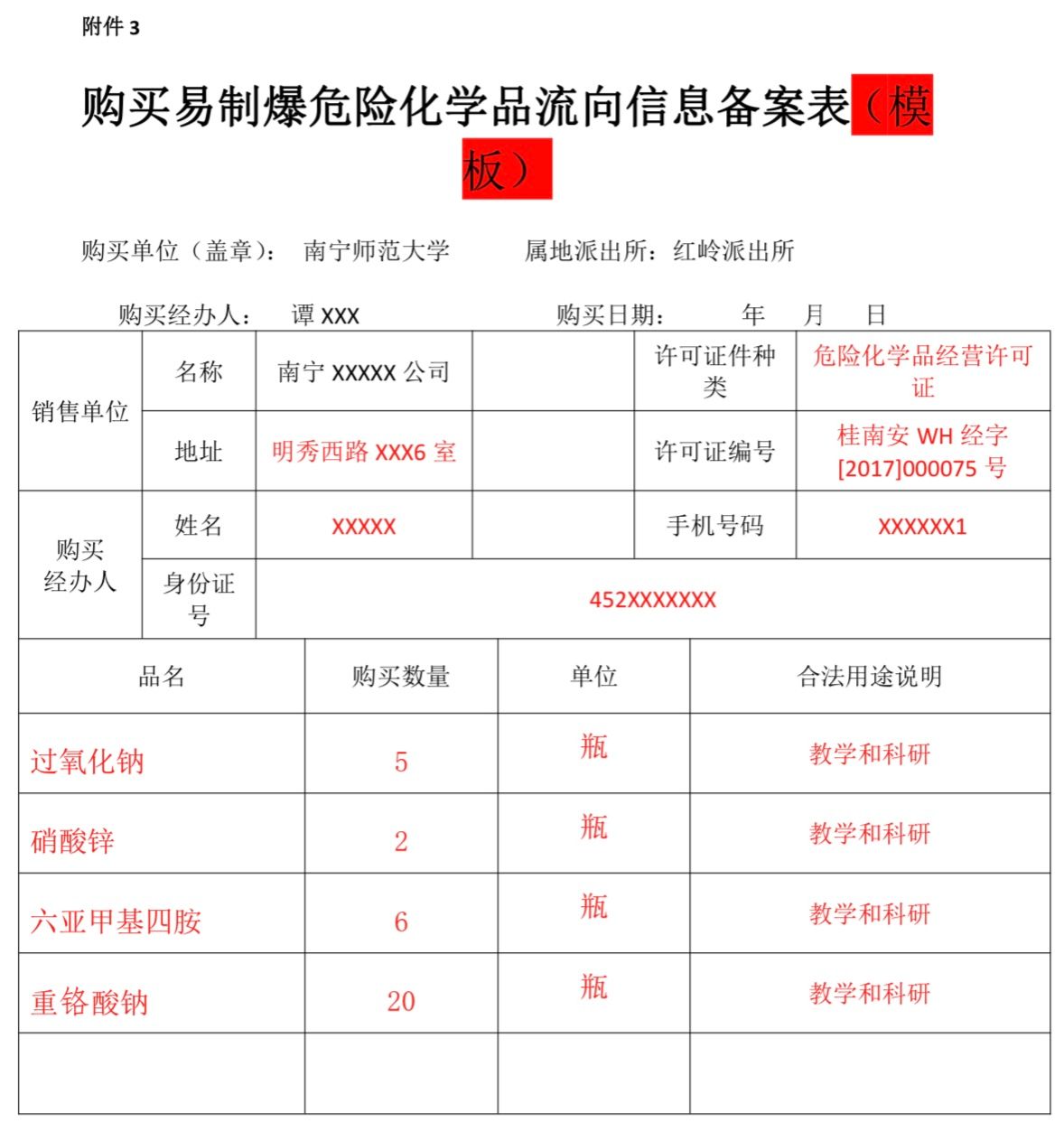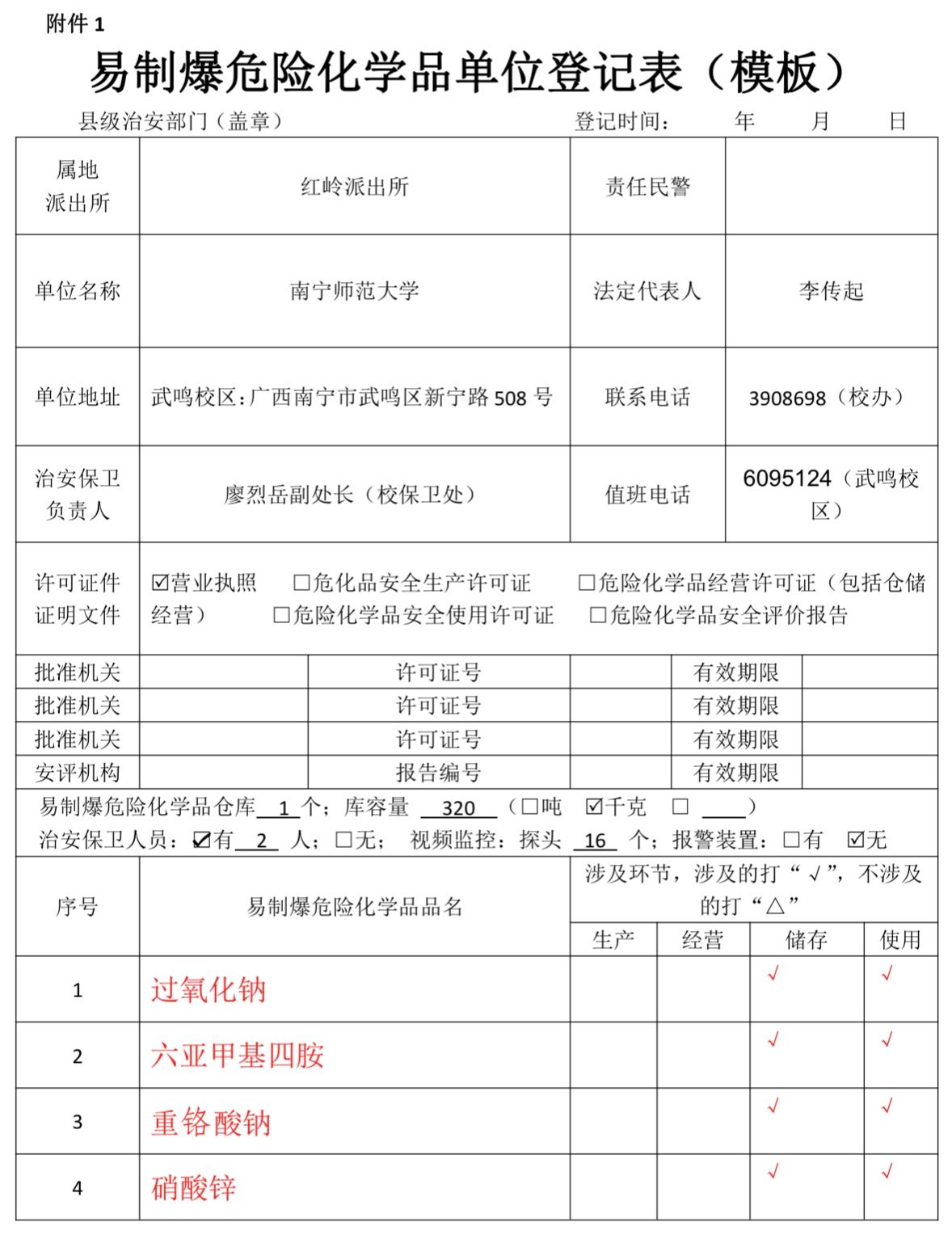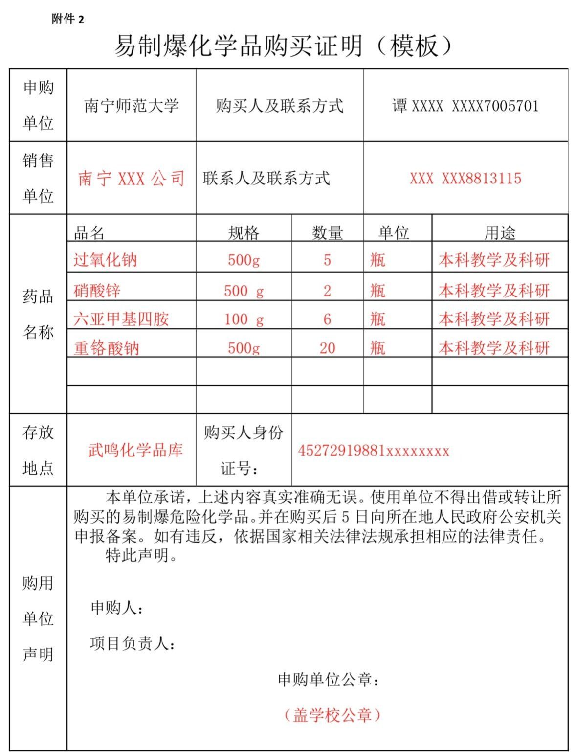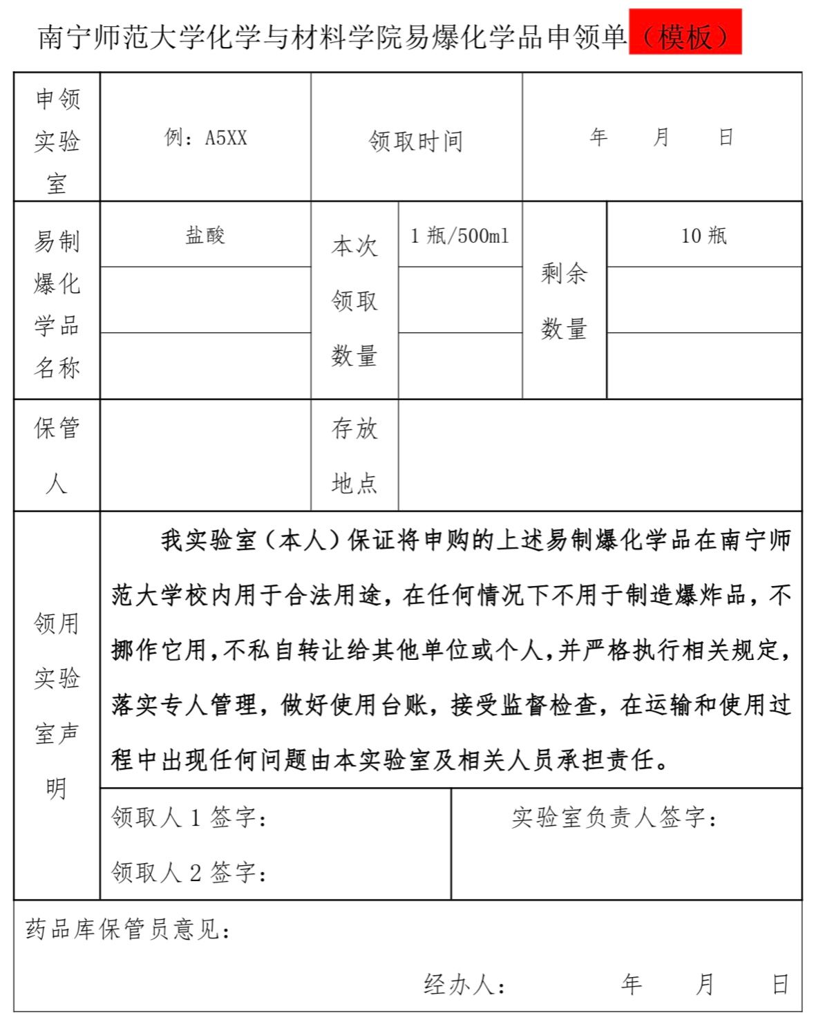 六、按需领取、合法出库、回库。领取药品后按照要求合法管理,并做好相关台账以备核查。药品库领取购买的易制爆品时请提供《南宁师范大学化学与材料学院易爆化学品申领单》,具体表格详见附件。
