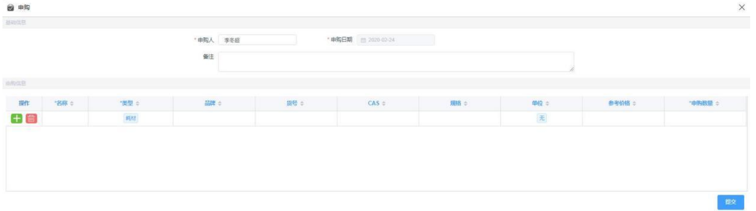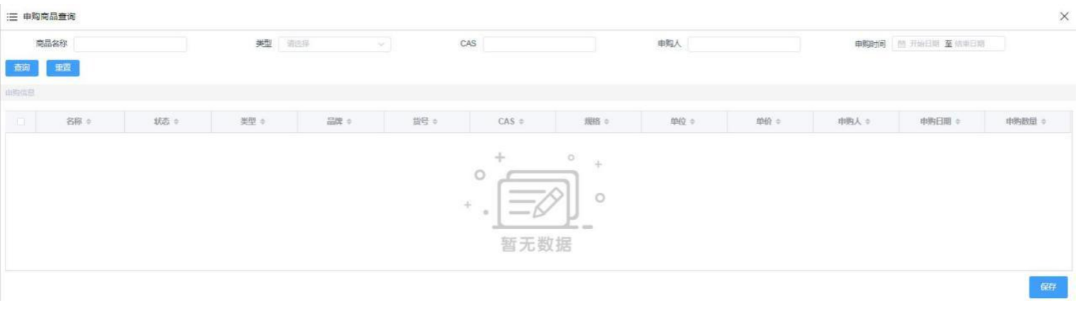 按钮,进入新增页面,再点击 按钮,勾选需要申购的数据,点击保存,就会生成采购单。