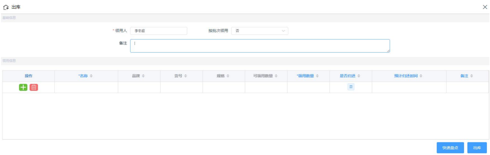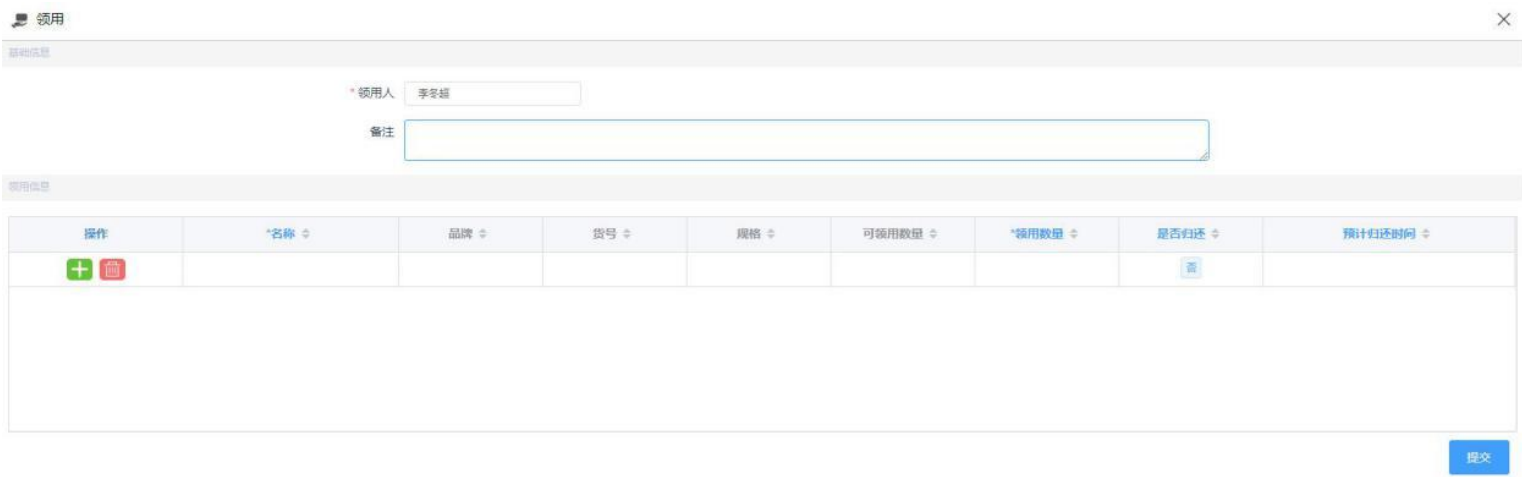 进入领用申请界面,选择需要领用的商品,填写领用数量、是否归还等信息, 点击“